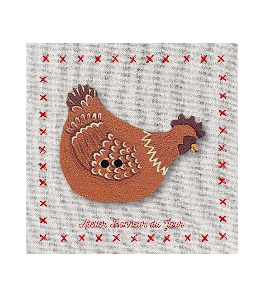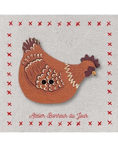 Descriptif : Bouton décoratif en bois, collection campagne "poule rousse" couleur brun, regarde à droite. Pour embellir, personnaliser et décorer vos ouvrages.