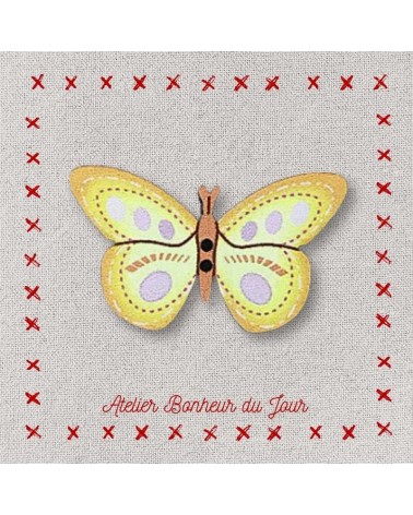 Descriptif : Bouton décoratif en bois, collection campagne "papillon en vol" couleur jaune. Pour embellir, personnaliser et décorer vos ouvrages.