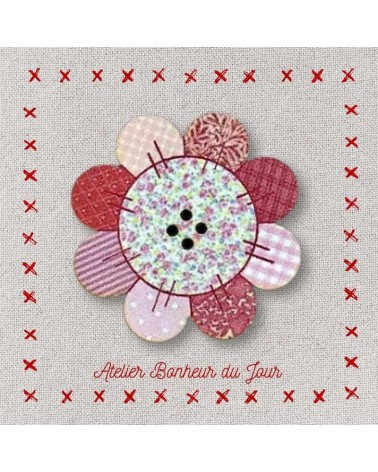Descriptif : Bouton décoratif en bois, collection mercerie "fleur patch" framboise. Pour embellir, personnaliser et décorer vos ouvrages.