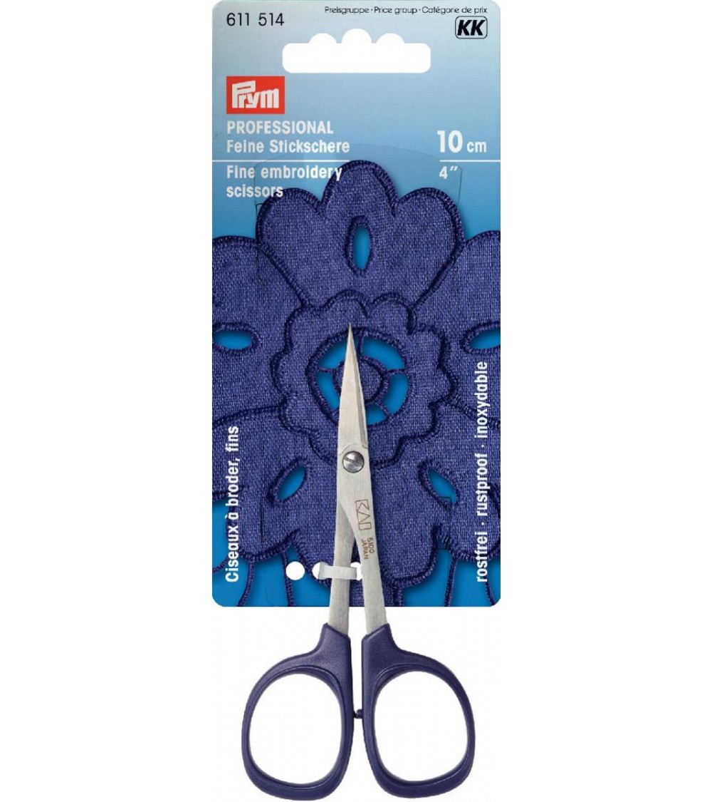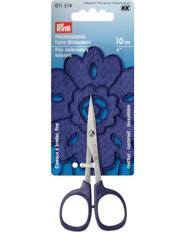 Descriptif : Ciseaux à broder PROFESSIONNEL Prym, fins, manches standard. Acier inoxydable/plastique. Offrent une précision de coupe au millimètre près, dans les moindres recoins.