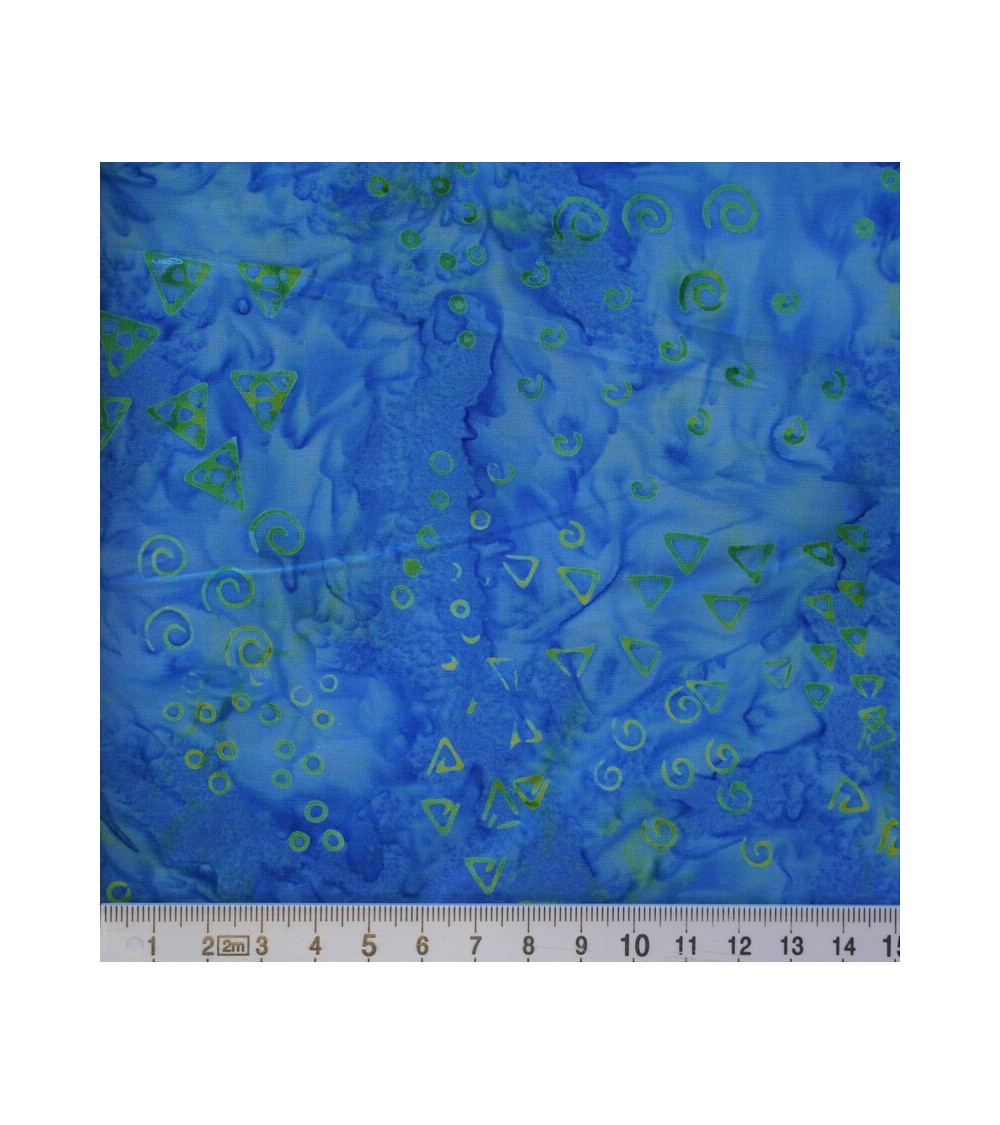 Descriptif : Tissu batik avec petites figures géométriques vertes sur fond bleu