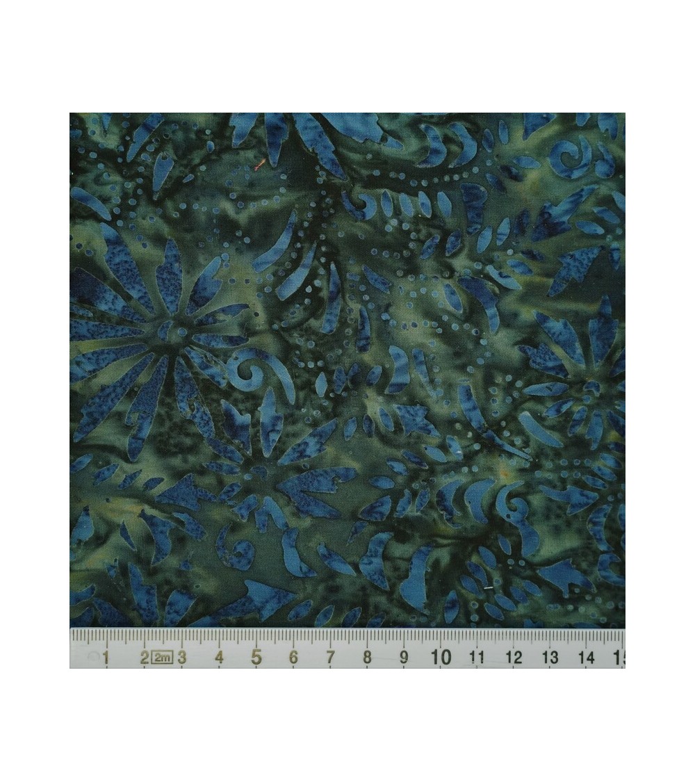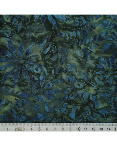 Descriptif : Tissu batik avec fleurs bleues sur fond vert