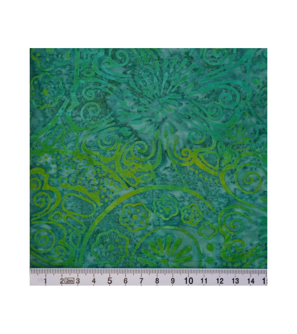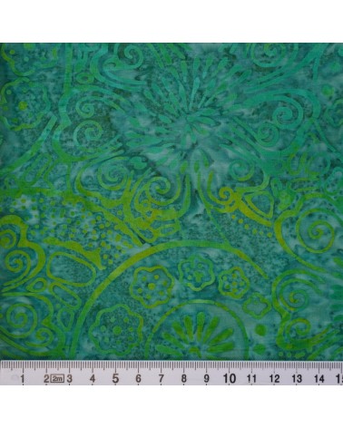 Descriptif : Tissu batik avec fleurs et arabesques vertes sur fond vert