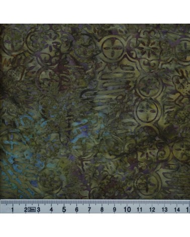 Descriptif : Tissu batik avec dessins abstraits coloris olive et brun sur fond violet et bleu