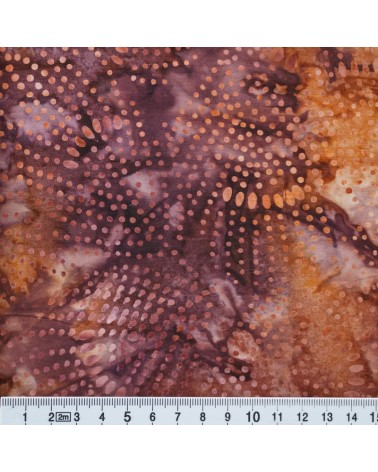 Descriptif : Tissu batik avec pointillés orange et bruns sur fond nuancé mauve brun