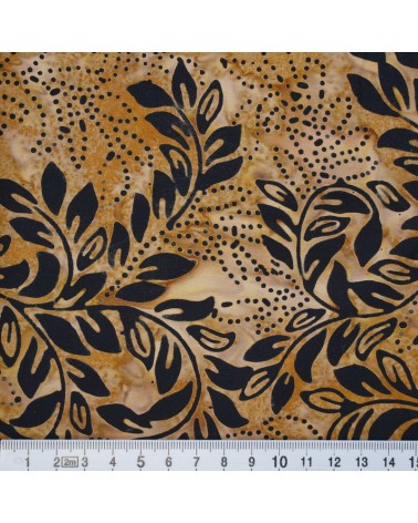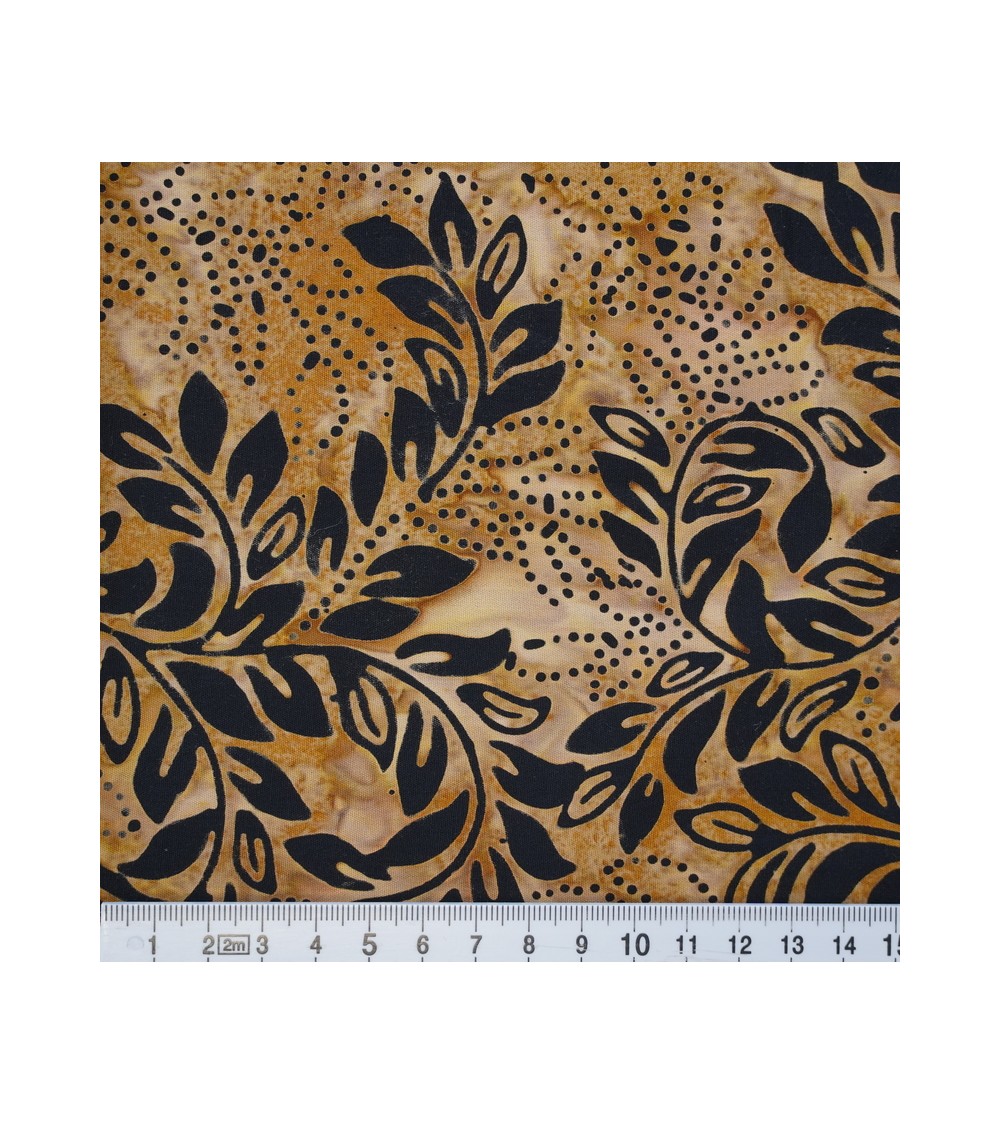 Descriptif : Tissu batik avec feuillage noir sur fond brun