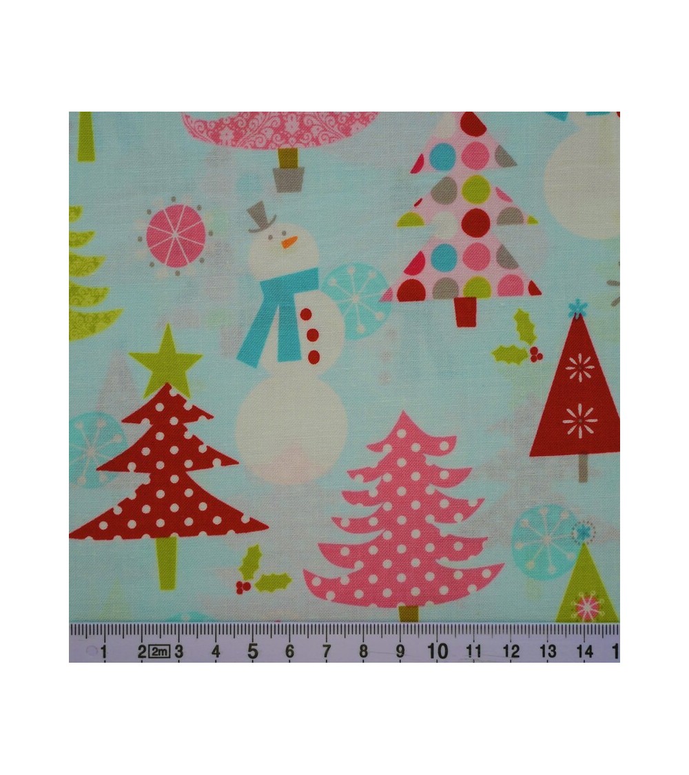 Descriptif : Tissu coton avec sapins multicolors et bonhommes de neige sur fond bleu ciel