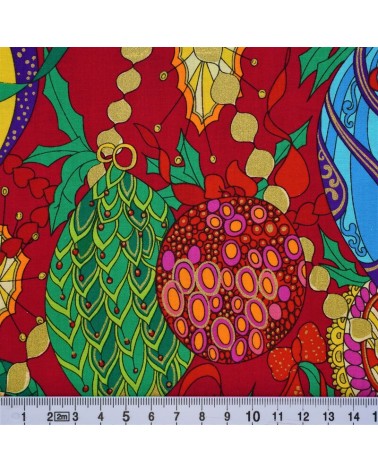 Descriptif : Tissu coton avec ornements de Noël multicolors sur fond rouge