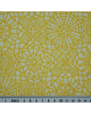 Descriptif : Tissu coton avec fleurs jaunes, effet dentelle, sur fond blanc