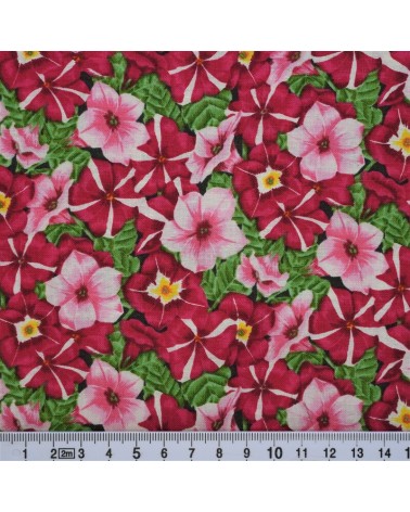 Descriptif : Tissu coton avec pétunias roses et feuilles vertes sur fond noir