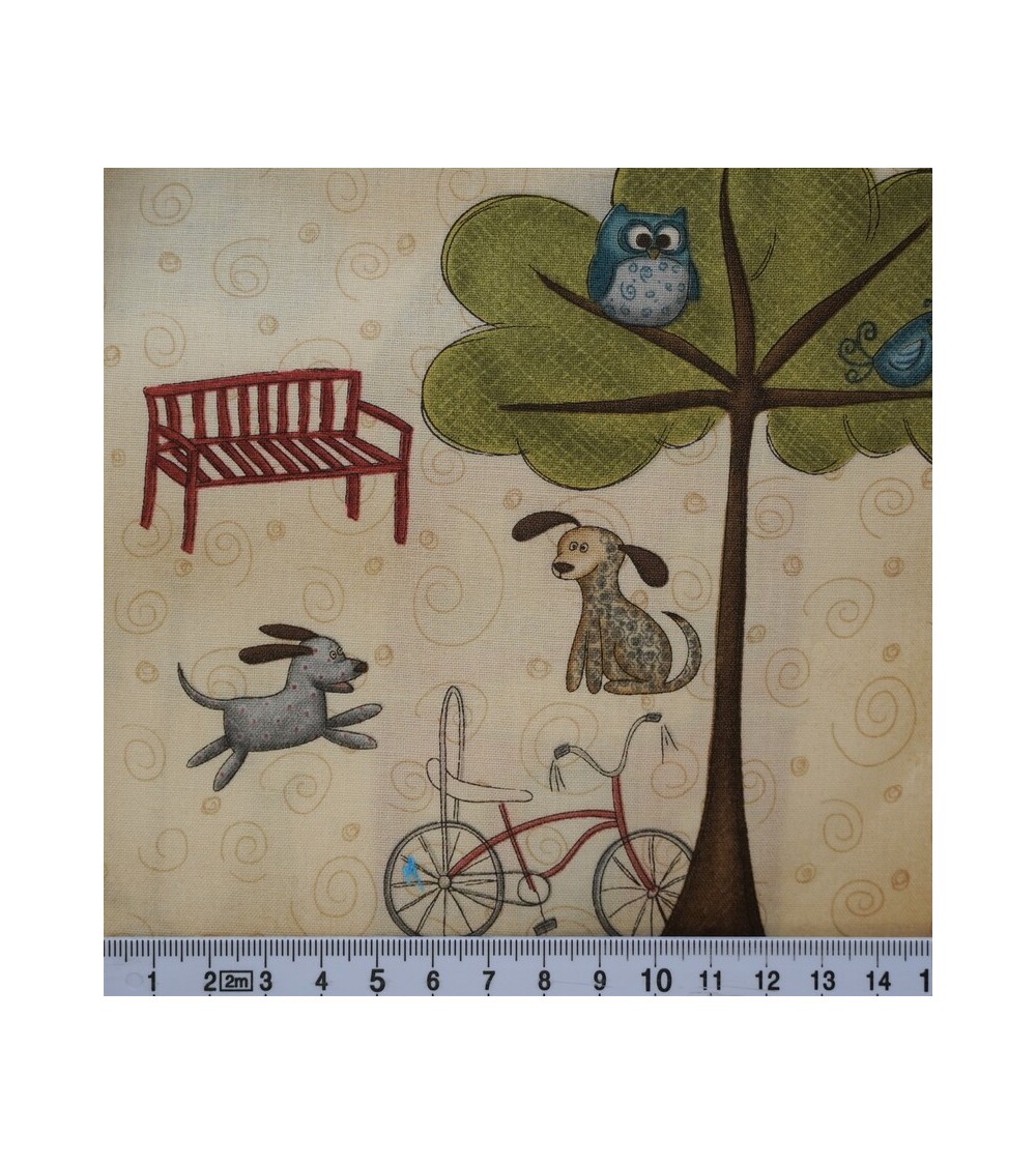 Descriptif : Tissu coton avec maisonnettes et animaux sur fond beige