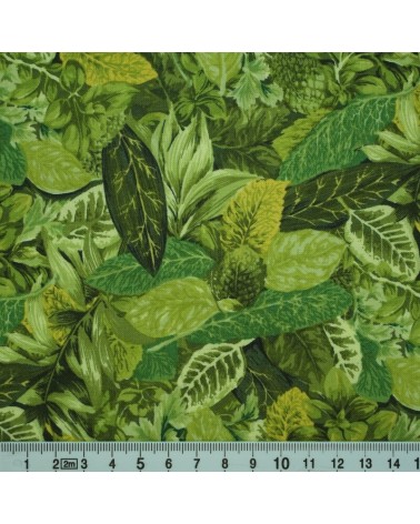 Descriptif : Tissu coton avec feuilles de plantes aromatiques en différents tons de verts