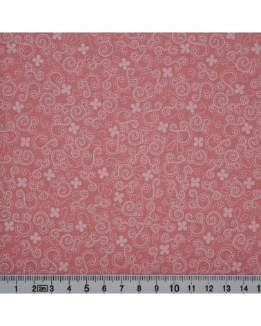 Descriptif : Tissu coton avec arabesques et petites fleurs blanches sur fond rose