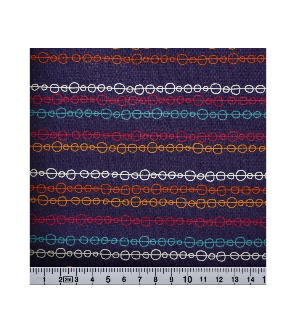 Descriptif : Tissu coton avec chaînettes orange, roses, bleus et blanches sur fond bleu marine