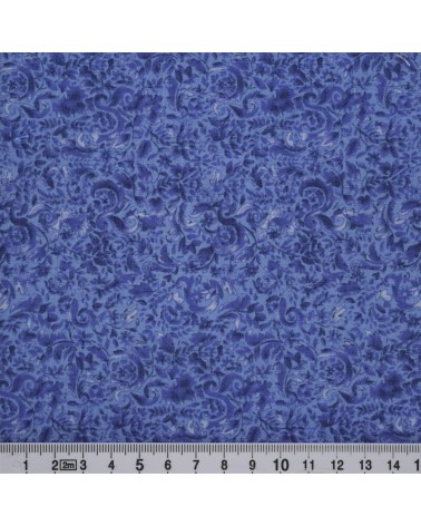 Descriptif : Tissu coton avec petites feuilles en bleu mauve sur fond bleu mauve