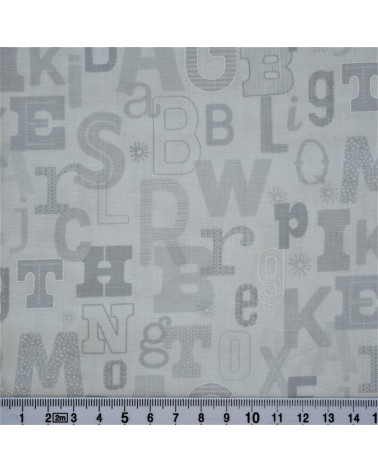 Descriptif : Tissu coton avec lettres en différents coloris de gris sur fond gris