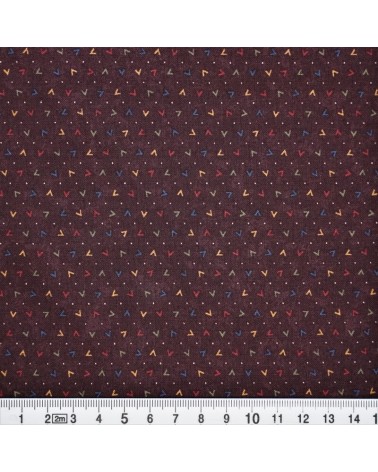 Descriptif : Tissu coton avec petits "V" verts, jaunes, rouges et bleus sur fond bordeaux