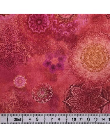 Descriptif : Tissu coton avec médaillons jaunes, violets et rose sur fond rose