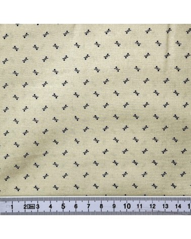 Descriptif : Tissu coton avec petits traits et pois noirs sur fond beige paille