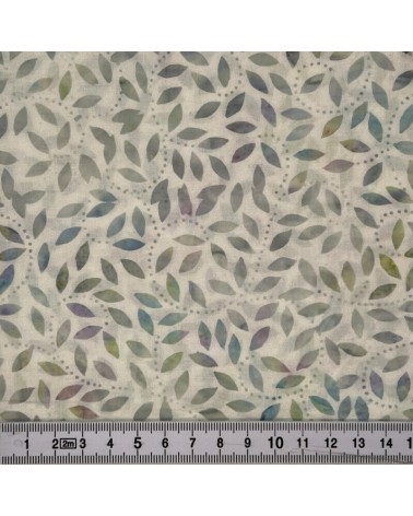 Descriptif : Tissu batik avec petites feuilles bleues, vertes et violettes sur fond beige