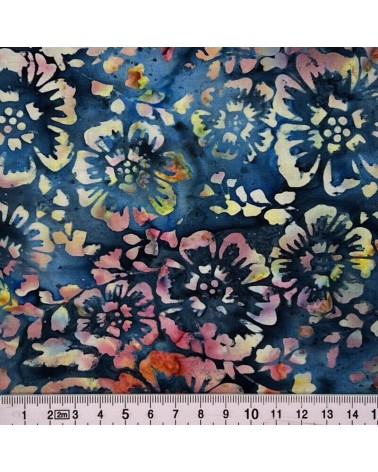 Descriptif : Tissu batik avec fleurs jaunes, orange et rose sur fond bleu