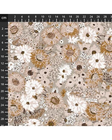 Descriptif : Tissu coton avec fleurs brunes, blanches et taupe sur fond gris