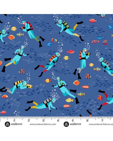 Descriptif : Tissu coton avec plongeurs sur fond bleu