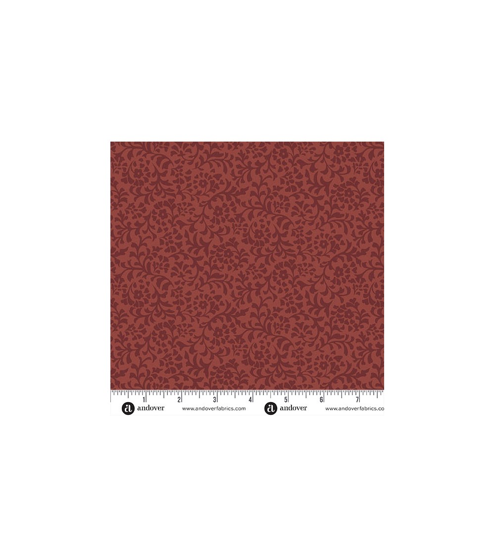 Descriptif : Tissu coton avec feuillage et fleurs bruns sur fond brun rouge