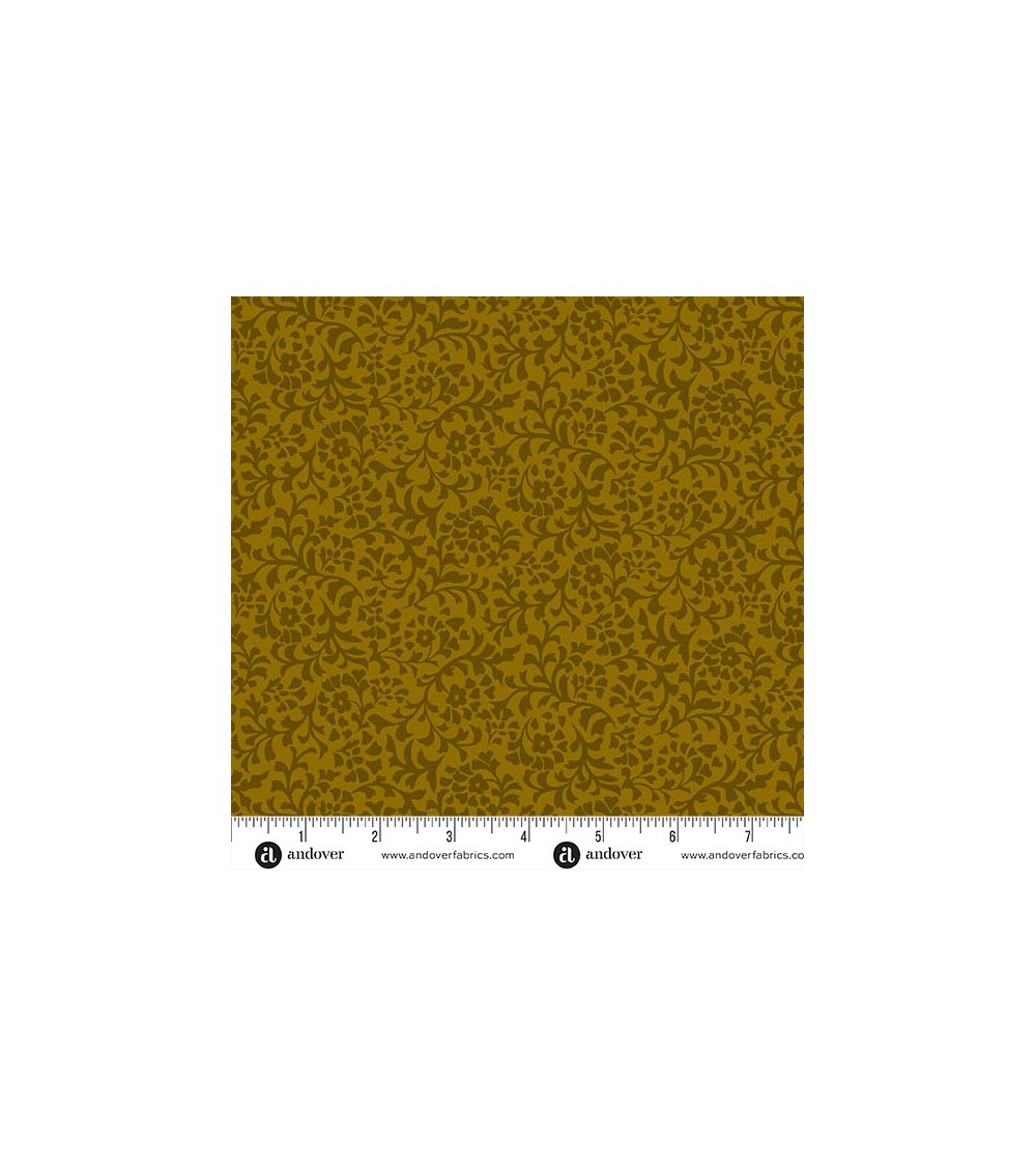 Descriptif : Tissu coton avec feuillage et fleurs brun sur fond brun moutarde