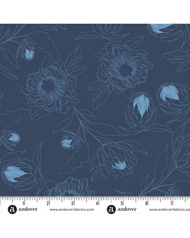 Descriptif : Tissu coton avec fleurs en contours bleu ciel sur fond bleu marine