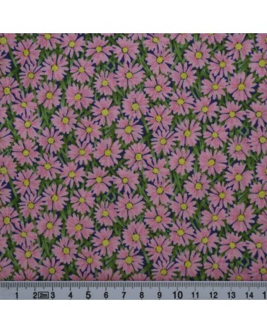 Descriptif : Tissu coton avec petites fleurs roses avec un coeur jaune et feuilles vertes