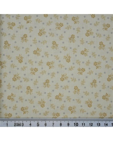Descriptif : Tissu coton avec petites fleurs et feuilles brunes et pois gris sur fond blanc cassé